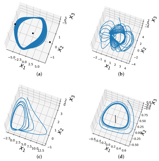 Hidden attractors of the test systems. (a) Chua system; the three equilibrium points are shown with black color to highlight the presence of the hidden attractor. (b) Sprott A system. (c) NE6 system. (d) LE4 system; the line of equilibrium has is plotted in black.