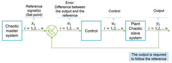 Synchronization scheme. Depiction of a master–slave feedback control where the output variables are required to follow the references (set points) generated by the master system . The error is the difference between the output and the reference. The control forces the output to follow the reference.