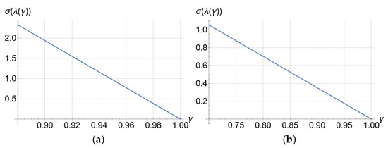 For projective synchronization, it is possible to find the value of the control parameter analytically so that the convergence of the synchronization error to zero can be made faster or slower according to the application. Through matrices , , the characteristic values are found as a function of , and its range of variation is determined. Parameter is selected, ensuring the characteristic values have a strictly negative real part, and so, the second condition stated at the end of Section 6.2 is met. By means of the standard deviation of the characteristic values , , found in the valid range of , the set of characteristic values that gives us the sought convergence (fast or slow). When , the set of associated characteristic values is very similar and not small in magnitude (due to the spectrum of variation of the values), and the convergence error quickly goes to zero. Then, determining the , in the range of variation of , the value of is found so that the error converges as fast as possible. Otherwise, is found.