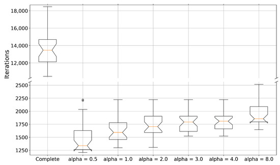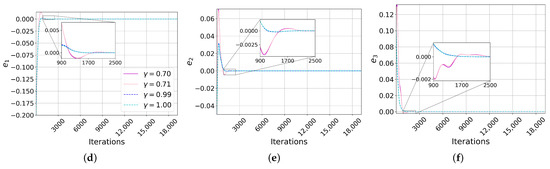 We further studied the rate of convergence by both control strategies applied to Chua’s system across a new set of initial conditions. The different initial conditions that we generated followed the methodology proposed by Danca [53]. With projective synchronization, we fixed the control parameter to the value that affords the fastest convergence, and we varied the scaling parameter and the different initial conditions. In each simulation, we looked for the first iteration from which each synchronization error was less than for all subsequent iterations. With complete synchronization, we also varied the initial conditions and looked for the iterations that satisfy each synchronization error to be less than . Finally, we compared the iterations found in order to analyze the convergence of the errors through them.