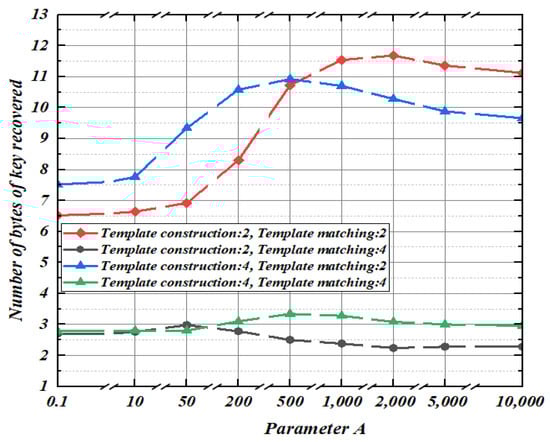 As shown in Figure 4, for modeling and matching under different noise standard deviations, the optimal solution of the parameter A is also different. When A ≥ 2000, the number of bytes recovered from the key tends to be stable. Therefore, in the subsequent experiment, we select A = 2000 for template construction.