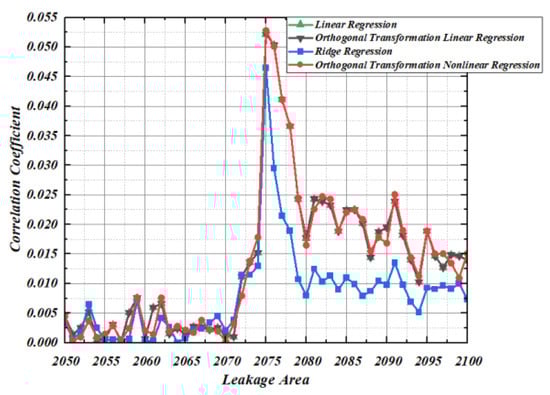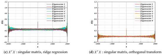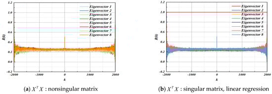 Based on the above theoretical analysis, the eigenvectors of the three methods can be tested by autocorrelation. Figure 7a shows the autocorrelation test results of characteristic matrix X when the matrix is a nonsingular matrix. It can be seen that the autocorrelation of the eight groups of eigenvectors is very weak, in micro correlation. Figure 7b–d shows the autocorrelation test results of characteristic matrix X when the matrix is a singular matrix. The results in Figure 7b,c show that there is a group of eigenvectors with strong autocorrelation in both linear regression and ridge regression, and the autocorrelation estimation R(k) of other eigenvectors is concentrated at about 0.3. Since the orthogonal transformation nonlinear regression projects the original data of the characteristic matrix X from the original space to the new space, the results in Figure 7d show that there are no eigenvectors with strong autocorrelation in the new space, and all eigenvectors have autocorrelation estimation R(k) closer to 0, showing good randomness.