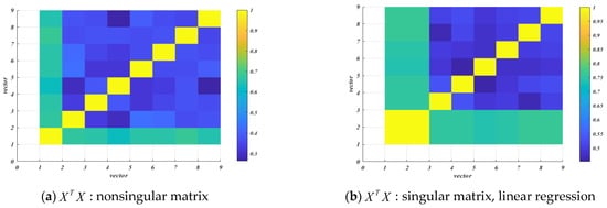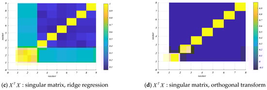 In Figure 8, the correlation coefficients between vectors of a matrix of linear regression, and orthogonal transformation regression as well as matrix of ridge regression are obtained, respectively. The correlation coefficient matrix is shown in Figure 8, and yellow indicates complete correlation. As shown in Figure 8a, when the matrix is a nonsingular matrix, each vector is only completely related to its own vector. As shown in Figure 8b, when the matrix is a singular matrix, vector 2 of linear regression is completely related to vector 1. As shown in Figure 8c, when matrix is a singular matrix, although ridge regression solves the problem of accurate correlation to a certain extent, there is still a strong correlation between vector 2 and vector 1, and the correlation coefficient reaches 0.99999984. As shown in Figure 8d, the minimum correlation coefficient between the vectors of the matrix in our proposed orthogonal transformation regression is close to 0, indicating that the matrix does not have collinearity. To summarize, orthogonal transformation regression solves the problem that the original linear regression singular matrix cannot be inversed.