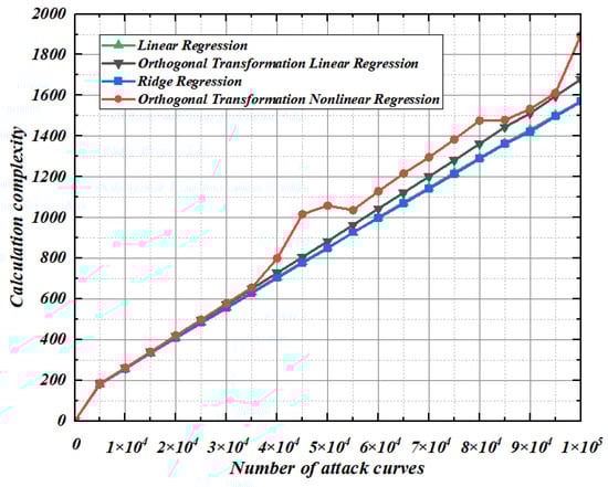 Modeling under the condition that the noise standard deviation is 2, 100 experiments are conducted for the four methods under a different number of template matching waveforms, and the comparison of the average calculation complexity of the 100 experiments is shown in Figure 11. It can be seen from Figure 11 that the computational complexity of the template analysis based on linear regression and template analysis based on ridge regression is almost the same. The template analysis based on orthogonal transformation regression proposed in this paper increases the amount of computation due to the projection of the characteristic matrix from the original space to the new space, so the computational cost is slightly higher than that of linear regression and ridge regression, but this computational cost is insignificant compared with the improvement of the attack efficiency in the template matching.