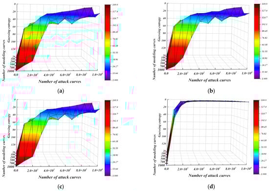 The guessing entropy of the four methods under different number of modeling curves and template-matching curves is shown in Figure 12. It can be seen from Figure 12 that the guessing entropy of the four methods gradually approaches 1 as the number of template-matching curves increases. In addition, regression models can build effective templates with few modeling curves. Comparing Figure 12a,c, it can be seen that although orthogonal transformation can solve the irreversibility of a singular matrix, orthogonal transformation linear regression has no effect on key guessing. The two methods have exactly the same guessing entropy results under a different number of modeling curves and template-matching curves. Although ridge regression has advantages in convergence speed compared with orthogonal transformation linear regression and linear regression, only the guessing entropy of template analysis based on orthogonal transformation nonlinear regression reaches 1 and the convergence speed is the fastest among the four methods under the condition of a limited number of template-matching curves. This means that the template constructed by the orthogonal transformation nonlinear model is more effective for the AES-128 algorithm with first-order mask protection.