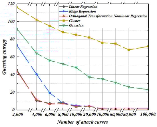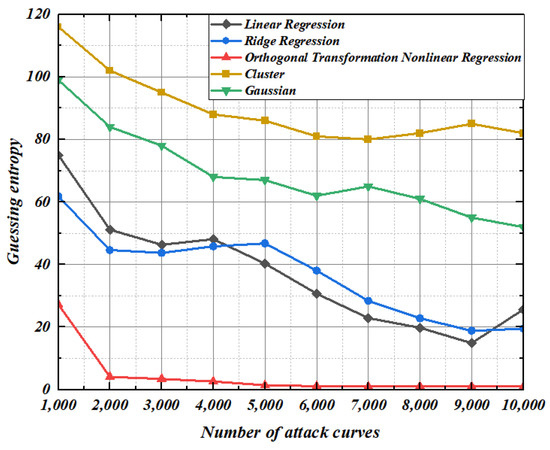 It can be seen from Figure 13 and Figure 14 that when modeling under the condition that the standard deviation of noise is 2, the guess entropy curves of ridge regression and linear regression are intertwined up and down, and the guessing entropy gradually approaches 1 as the template-matching curve increases. In this scenario, the nonlinear regression based on orthogonal transformation only needs 7000 and 80,000 power traces, and the guessing entropy reaches 1, which means that all bytes of the guess key are successfully recovered. Compared with ridge regression and linear regression, our method reduces the power traces required for key recovery by at least 30% and 20%, respectively. Gaussian modeling method and cluster-based modeling method have a high guess entropy, which is not enough to recover the correct key under the limited number of power traces.