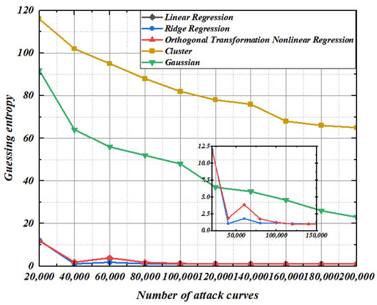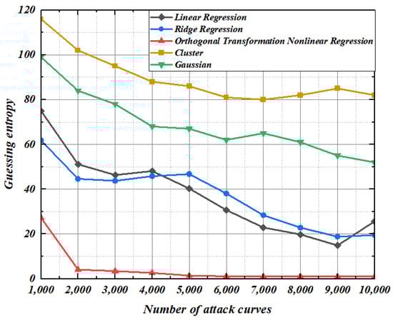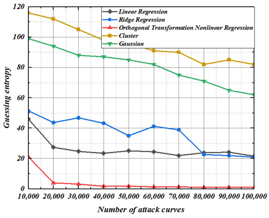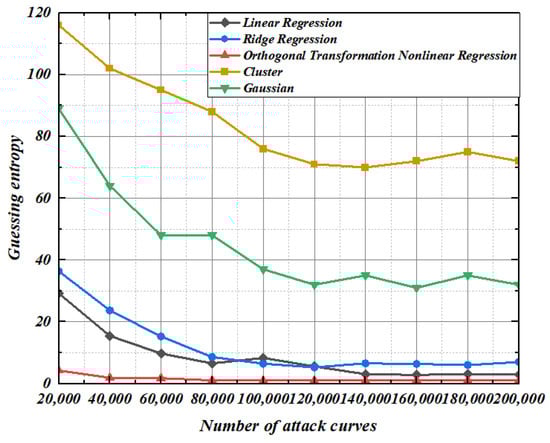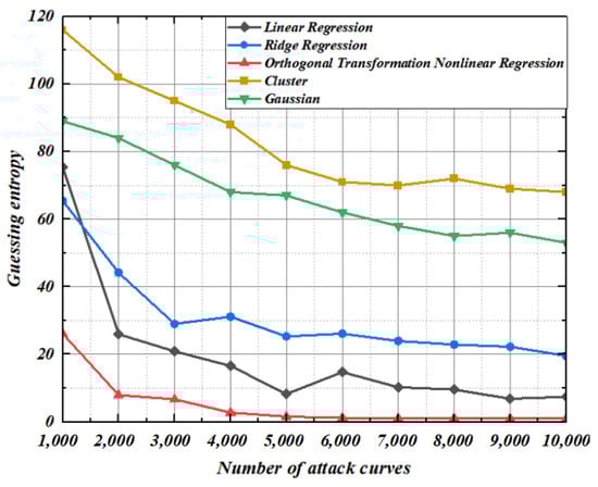 It can be seen from Figure 17, Figure 18 and Figure 19 that the template-matching curve required for guessing the key of the template constructed by the five methods increases exponentially with the increase of the order. The guessing entropy curve of the second-order template constructed by ridge regression and linear regression is intertwined, but with the increase of the order, because the ridge regression coefficient occupies too much space contributed by the original characteristic matrix, the guessing entropy of the fourth-order templates is even higher than that of the linear regression. In the scenario of the fourth-order template, the guessing entropy of nonlinear regression based on orthogonal transformation proposed in this paper only needs 40,000 template curves to reach 1, while the linear regression needs 80,000, and the guessing entropy of 1.3125 does not converge to 1 when the ridge regression is 100,000. The guess entropy of linear regression and nonlinear regression based on orthogonal transformation is completely consistent at the eighth-order template. Although ridge regression converges quickly when the template curve is insufficient, the guessing entropy of linear regression and nonlinear regression based on orthogonal transformation converges to 1 at 120,000 template curves. At this time, the guessing entropy of ridge regression is 1.0625, until the guessing entropy of 140,000 template curves ridge regression completely converges. The Gaussian modeling method and cluster-based modeling method have a worse effect on guessing the key in higher-order template analysis. The guessing entropy convergence speed of nonlinear regression based on orthogonal transformation, whether in order 2, 4, or 8, with limited number of template-matching curves, reaches 1 at the fastest time to complete the key convergence, indicating that the higher-order modeling effect of nonlinear regression based on orthogonal transformation is optimal and stable.