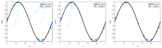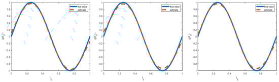The estimated function and true function of for three priors: type I (left panel), type II (middle panel), type III (right panel) in the second simulation.