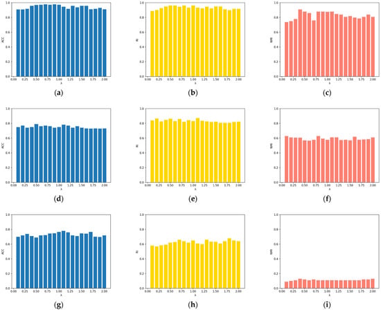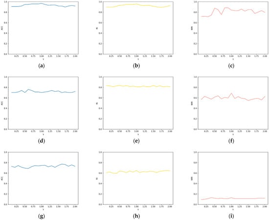 The sensitivity of when : (a) ACC of Iris dataset with ; (b) RI of Iris dataset with ; (c) NMI of Iris dataset with ; (d) ACC of Zoo dataset with ; (e) RI of Zoo dataset with ; (f) NMI of Zoo dataset with ; (g) ACC of PCMAC dataset with ; (h) RI of PCMAC dataset with ; (i) NMI of PCMAC dataset with .