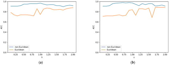 Comparison of Euclidean distance and non-Euclidean distance at ACC: (a) ACC of Iris dataset with ; (b) ACC of ZOO dataset with .