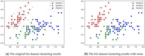 The effect of noise on the Iris dataset: (a) without noise; (b) with noise.