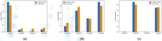 To demonstrate the performance of the proposed algorithm under the influence of noise, a new experiment was designed for the Iris dataset. In the Iris dataset, uniformly distributed data from 0 to 1 were randomly assigned as new noise features. Furthermore, to compare the effect with and without noise, we compared experiments for the original dataset and the dataset with noise. As shown in Figure 4, the noise only slightly affected the clustering results. This shows that the performance of the proposed algorithm remained good even though the noise affected the dataset. Moreover, as shown in Figure 5, the noise did not influence the assignment of feature weights. This confirms the high accuracy and stability of the algorithm.
