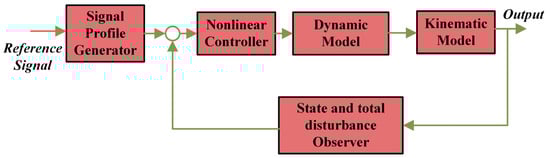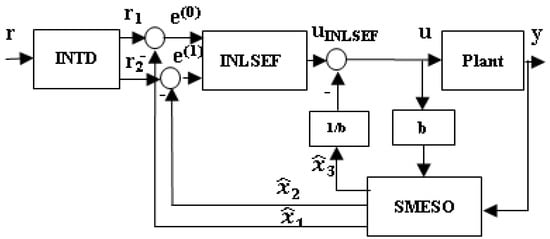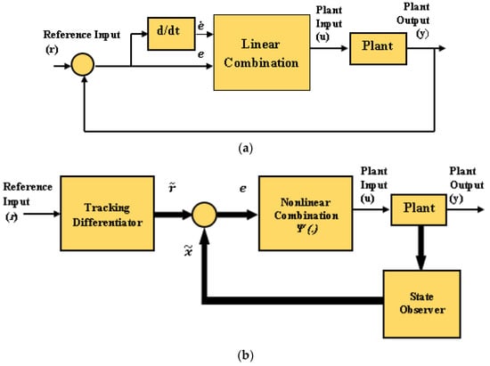 Generally, in most engineering applications, disturbances/uncertainties (D/Us) are widely presented and negatively affect the performance of the control systems []. Control engineering strives to minimize D/Us, and feedforward methods may attenuate or reject the effect of disturbances that can be detected through measurement []. Nevertheless, exogenous disturbances cannot be calculated or are exceptionally difficult to calculate. The first spontaneous thought to treat this challenge is to build an observer to estimate the disturbance. Then, an activation signal can be established to compensate for the exogenous disturbance effect. The simplicity of this indication can be expanded to also reject uncertainties. The unmodeled effects of uncertainties or dynamics can be estimated as a proportion of the overall disturbance. As a consequence, a new term was introduced for disturbance activity, which is known as “total disturbance”, which describes the accumulation of exogenous disturbances, unmodeled dynamics, and uncertain conditions in plants. This class of techniques is denoted as estimation and attenuation of disturbance/uncertainty (EAD/U). Several EAD/U structures have been individually suggested. Han first suggested an extended state observer (ESO) in the 1990s []. An ESO is generally viewed as playing a major essential role in the technique termed active disturbance rejection control (ADRC) []. ADRC consists of three essential parts: a tracking differentiator (TD), extended state observer (ESO), and nonlinear state error feedback controller (NLSEF).