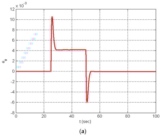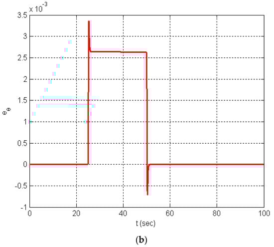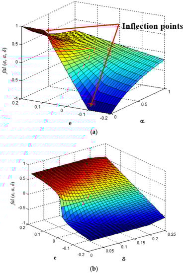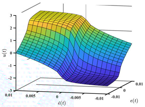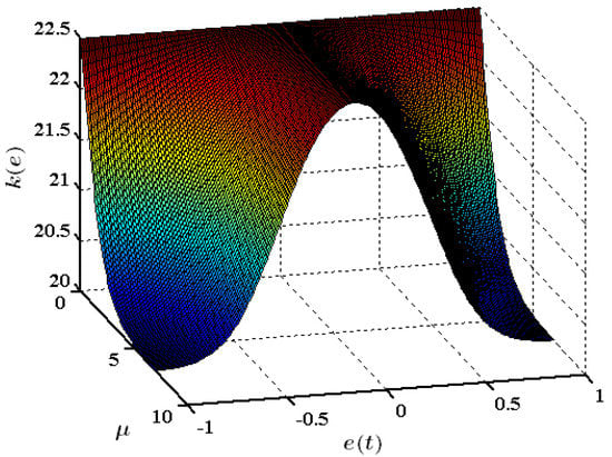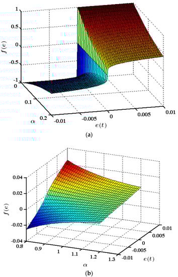 Equation (24) shows significant features in the nonlinear term . For , the term rapidly switches its state, as shown in Figure 5a. This feature makes the error function () sensitive to small error values. When exceeds 1, the nonlinear term becomes less sensitive to small variations in (see Figure 5b).