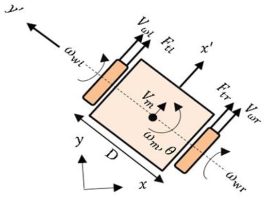 where is the longitudinal velocity of the center of mass; is the angular velocity of DDMR; and are the longitudinal velocities of the left and right wheels, respectively; and are the angular tire velocities of the left and right wheels, respectively; and is the nominal radius of the tire.