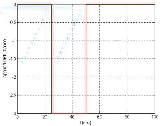 The DDMR was tested by applying reference angular velocities for both wheels of 1 rad/s at t = 0 and t = 100 s. To examine the proposed IADRC performance, an exogenous torque acting as a constant disturbance was applied to the right wheel during the simulation at t = 30 and removed after 20 s. Figure 11 shows the applied external disturbance. Figure 12 shows the transient response of the controlled PMDC motor for the right wheel when both the ADRC and the IADRC are applied. The figure shows an enhancement in system response before and during the applied disturbance when the IADRC is adopted; this behavior is evident in Figure 12c,d.