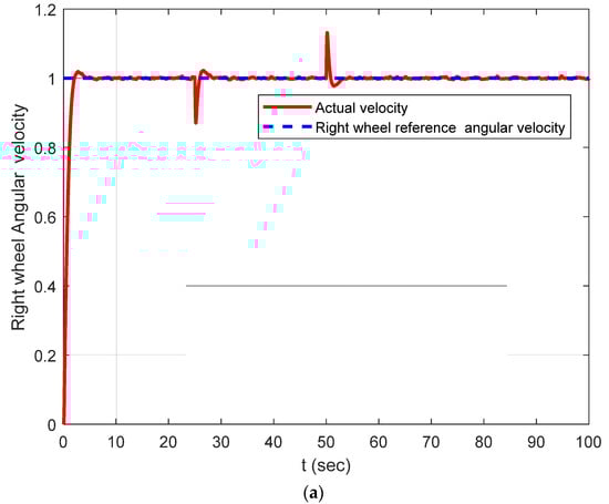 The PMDC motor coefficient values are set to La = 0.82, Ra = 0.1557, Kt = 1.1882, Kb = 1.185, Beq = 0.3922, Jeq = 0.2752, and n = 3.0. The DDMR used in the simulation is assumed to have the following coefficients: D = 0.40 and rw = 0.075. The coefficients of the classical ADRC controller are δ1 = 0.4620, δ2 = 0.24807, α1 = 0.1726, α2 = 0.8730, β1 = 30.4, β2 = 523.4, β3 = 2970.8, and R = 100. The coefficients of the proposed IADRC scheme include the coefficients of the NLSEFC, which are expressed as k11 = 144.6642, k12 = 8.0475, k21 = 25.5574, k22 = 4.8814, k3 = 0.5308, δ = 3.8831, μ1 = 44.3160, μ2 = 48.8179, μ3 = 26.1493, α1 = 0.9675, α2 = 1.4487, and α3 = 3.5032. The ITD suggested in this paper has a set of coefficients expressed as α = 0.4968, β = 2.1555, γ = 11.9554, and R = 16.8199. Kα = 0.6265, α = 0.8433, Kβ = 0.5878, β = 0.04078, β0 = 30.4, β1 = 513.4, and β2 = 1570.8 represent the coefficients of the SMESO used in this work.