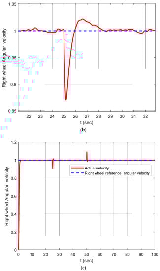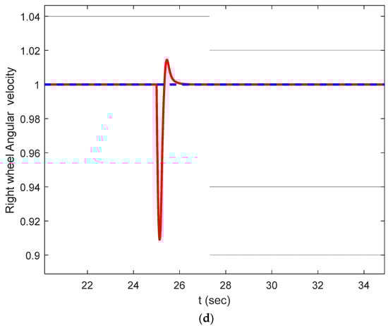 Simulation results: (a) the angular velocity of the right wheel using classical ADRC; (b) close-up of the response depicted in (a); (c) the angular velocity of the left wheel using IADRC; (d) close-up of the response depicted in (c).