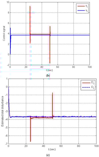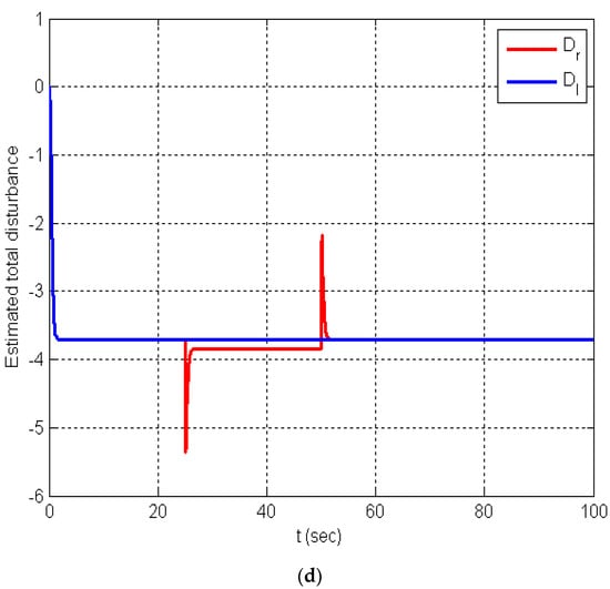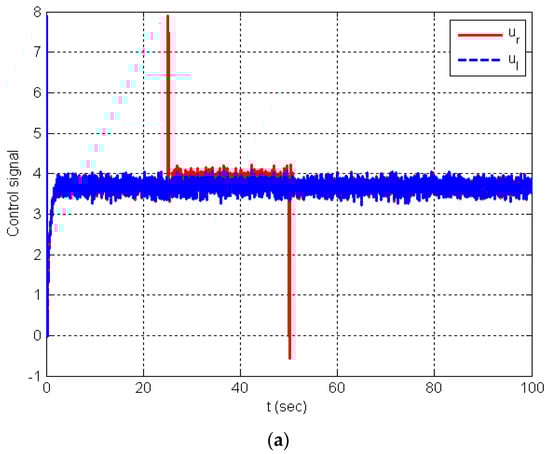 The chattering phenomenon found in the estimated total disturbances produced by the LESO of the conventional ADRC for both wheels (Dr and Dl) are extremely reduced by using the SMESO of the proposed IADRC. The same is true of the control signals that drive the two wheels ( and ; see Figure 14), where a very smooth control signal is obtained as a result of the slight increase in the overshot (compare Figure 14a,b).
