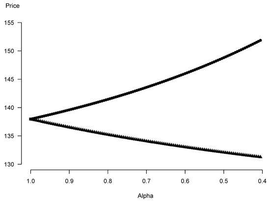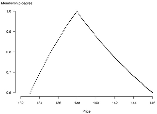 Figure 2 illustrates the membership function of the forward contract’s price. What is remarkable is the triangular shape of the membership function resembling shapes of membership functions of the triangular fuzzy numbers in Table 1. This is a practical proof of stability of the fuzzy pricing method inasmuch as values of the parameters are arbitrarily picked out. From both these plots one can also conclude that the range of values of the right ends of the fuzzy forward price is wider than the range of values of the left ends (the right side of the “triangle” is longer). The possibilistic mean, by its construction, enables to identify and quantify such asymmetry. For our exemplary data the longer right side results in the bigger weighted possibilistic mean (equal to 140.36) than the modal value of the fuzzy price (equal to 137.96). If one selects weighting functions which are convex and therefore take bigger values than the linear as becomes closer to the weighted possibilistic mean predominantly mirrors the shape of the membership function near its peak. For the sample data, the difference between legs of the “triangle” diminish when values of the membership function approach 1. This is the reason why for we have , which is slightly closer to the modal value of the price than picking