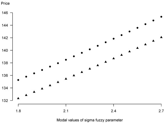In the beginning, it is worth recalling the work [31], which gave rise to the pricing of European options by combining stochastic and fuzzy methods, where the underlying financial instrument was described by a geometric Brownian motion, as in the case of the traditional Black–Scholes model. Within the same continuous model of the underlying instrument, refs. [32,33,34,35] remained, using fuzzy estimation, adaptive fuzzy numbers, or focusing the attention on reload and Asian options. Ref. [36], also applying the geometric Brownian motion, proposed a different approach, based on the rational expected option price depending on a fuzzy goal. Ref. [37] used triangular approximations to improve the fuzzy Black–Scholes option pricing formula.