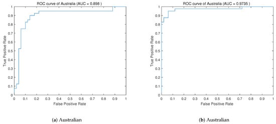 ROC curve of the Australia data set, (a) the ROC curve before improvement, (b) the ROC curve after improvement.