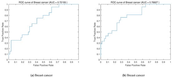 ROC curve of Breast cancer data set, (a) the ROC curve before improvement, (b) the ROC curve after improvement.