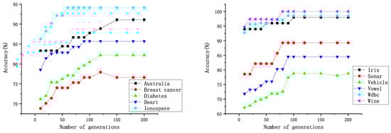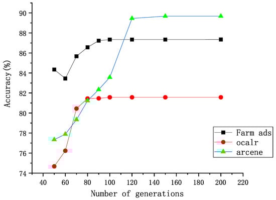 It can be seen from Figure 1 that the accuracy of all data sets fluctuates with the increase of the number of selected features. This means that many or few features do have a big impact on the accuracy of the data set. The few features make the model poorly learned. The excessive features will increase the training time and affect the efficiency. Moreover, the useless or redundant features will decrease the accuracy of the classifier. For the 14 selected data sets, the accuracy changes with the number of selected features, and the accuracy does not always increase with the number of features. Take the data set Sonar as an example: it has the highest accuracy at 40 features and decreases when the number of features continues to increase. As shown in Table 1 and Table 3, the number of features selected from some data sets (Iris, Vehicle, Diabetes, Australia) is close to that of the original data set when the accuracy reaches the highest. For example, the data set Diabetes has only one feature reduced compared to the original data set, while the data set Australia has only three features reduced compared to the original data set, although the number of features in these data sets is small. However, for some data sets (Farm Ads, Oclar, Arcene) with a large number of original features, the number of selected features at the time of reaching the highest accuracy is much lower than before after feature selection. For example, the data set Farm Ads decreases from 54,877 features to 1858 features, and the data set Oclar decreases from 3916 features to 435 features.