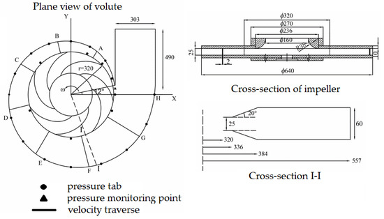 Pump geometry of the centrifugal pump and the locations of velocity and static pressure measurement ([18]. Kelder, J.D.H.; Dijkers, R.J.H.; van Esch, B.P.M.; Kruyt, N.P. Experimental and theoretical study of the flow in the volute of a low specific-speed pump. Fluid Dyn. Res. 2001, 28, 267–280. https://doi.org/10.1016/S0169-5983(00)00032-0).