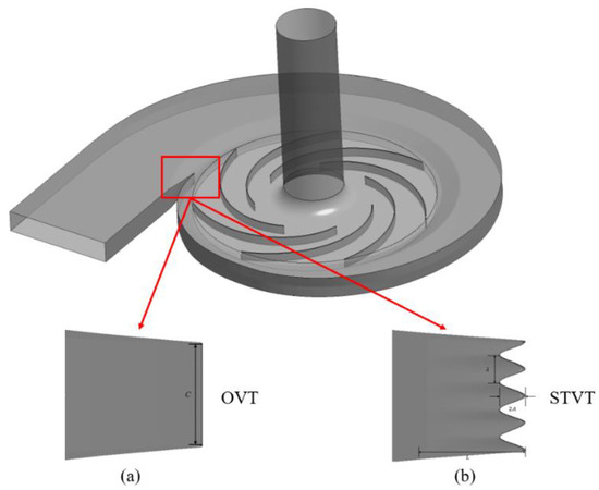 Inspired by bionics, this sinusoidal shape of the nodule was applied to the volute in this study. Lin et al. [17] designed three shapes of bionic tongues to study the effect of different amplitude sinusoidal tubercle shapes on the performance of the volute tongue. The authors analyze the effects of the rotor−stator interaction and energy loss characteristics to study the reason why the bionic tongue affects the centrifugal pump performance. A feasible solution is provided to enhance the pump’s stability and reduce the vibration noise of the centrifugal pump.