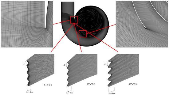 Figure 2 and Table 2 show the structures and parameters of sinusoidal tubercle volute tongues (STVT) with different amplitudes devised based on the original volute tongue (OVT), where is the distance between two adjacent sinusoidal nodules and is the sinusoid’s amplitude. The bionic volute tongues were designed to contain four tubercles. Because the volute tongue’s width (C) is 25 mm, the value was 7.5 mm. The values of in sinusoidal tubercle volute tongues were 1 mm, 2 mm, and 3 mm. The longitudinal length of the sinusoidal grooves near the tongue was 15 mm. Along the direction of the tongue profile line, the groove depth decreases gradually from 2 to 0.