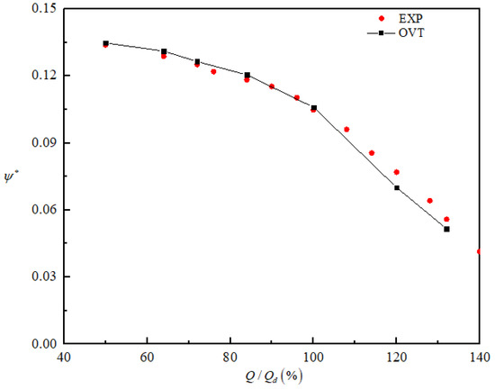 As shown in Figure 4, the numerical simulation of the head curve coincided with the actual experimental head curve under small flow conditions, but there was a small difference when .