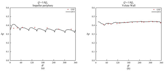 A comparison between the numerically simulated and experimental static pressures at 1.0Qd flow condition is shown in Figure 5; Figure 5a,b shows that the simulation of static pressure around the impeller and the volute wall agrees well with the experimental. Therefore, the accuracy of the numerical method selection was verified.