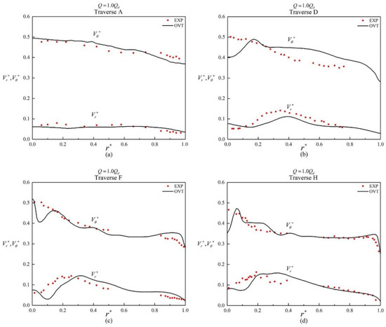 Figure 6 shows a comparison between the numerically simulated and experimentally time−averaged circumferential and radial velocity components on the A, D, F, and H traverses (Figure 1) under a 1.0Qd flow condition and in good agreement. The accuracy of the numerical method is further illustrated.