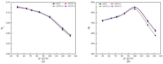 Overall, the four model pumps’ performance curves followed the same trend. The performance of different amplitude sinusoidal tubercle pumps was superior to that of the prototype pump. Under the design flow rate, the difference in the head coefficients of the four pumps was not significant, and the differences between the three bionic pumps and the prototype pump were 1.4% (STVT−1), 2.3% (STVT−2), and 2.4% (STVT−3). Under high flow rates, the difference widened slightly, particularly for STVT−3, which increased to 7.8%. Under low flow rates, there was little difference in efficiency between the four pumps. At 0.84Qd, the bionic pump efficiency was significantly higher than that of the prototype pump, and this difference reached a maximum at 1.32Qd. At 1.0Qd, the differences in efficiency between the three different amplitude sinusoidal tubercle pumps and the prototype pump were 1.3% (STVT−1), 1.7% (STVT−2), and 2.1% (STVT−3). The relative increases were 7% (STVT−1), 8.1% (STVT−2), and 9.2% (STVT−3) at 1.32Qd. The comparison revealed that the performances of all the bionic pumps were better than those of the prototype pump, with the model STVT−3 being the best.