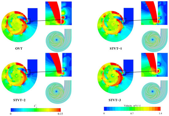 Figure 8 shows the distributions of the pressure coefficients (upper left) and velocity streamlines (lower right) at the cross sections of the four pumps. Evidently, the pressure fluctuation is highest near the tongue, downstream of the impeller channel, and in the area of the impeller outlet. Simultaneously, it is noticed that the pressure fluctuation in the tongue region is the strongest, indicating that the flow there is extremely unsteady owing to the influence of the rotor−stator interaction. By observing the distribution of pressure coefficients in the tongue region, STVT−1, STVT−2, and STVT−3 were found to have more uniform pressure coefficient distributions and fewer high−pressure regions. This indicates that the bionic tongue can improve the flow inside the centrifugal pump, making the internal flow field structure more stable with less pressure fluctuation. Among them, the pressure fluctuation at the STVT−3 tongue is the lowest, and the interaction between the rotor and the stator has the least effect on it.
