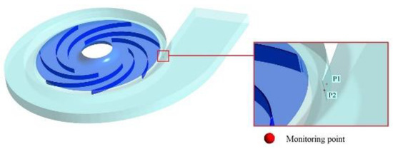 As shown in Figure 9, two monitoring points were set near the tongue to record the transient pressure at each time step during the simulation. P1 was set inside the volute facing the impeller, and P2 was set right on the leading edge of the tongue. Then, we quantitatively analyze the strength of the pressure fluctuation in each pump.