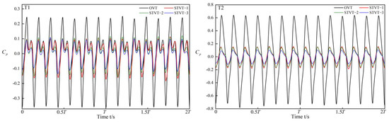 Compared to the enstrophy distribution of the OVT profile, the high−energy dissipation region of the STVT−3 profile is reduced to varying degrees in each cross−section. In Section 1, the high−energy dissipation region of the STVT−3 profile extends along the groove of the sinusoidal tongue, occupying a smaller area than the prototype pump. In Section 2, this phenomenon is even more obvious, with the energy loss area of the STVT−3 profile splitting from the entirety of the OVT profile into a slender strip of area. As described above, enstrophy is directly related to the kinetic energy that corresponds to the dissipation effects in the fluid. The sinusoidal structure of the bionic tongue makes the high dissipation area near the downstream and of the tongue much smaller, resulting in lower energy loss. In Section 3, the high−energy loss area of the STVT−3 profile disintegrates into several small pieces. Compared to the OVT profile, the total area occupied by this region was significantly reduced. In particular, at times T3, T4, and T5, there are almost no high−energy loss areas. However, in Section 4, the high energy loss area of the STVT−3 profile is much weaker than that of the OVT profile in all instances, and large high−energy loss areas exist. This indicates that the bionic tongue has a significant impact on reducing pressure fluctuations in the tongue region, which will also reduce energy loss. Furthermore, this improvement has a relatively small effect in Section 1 and Section 2 near the wall and a significant effect in Section 3 and Section 4.