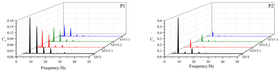 Figure 10 and Figure 11 show the pressure fluctuations in the frequency and time domains at P1 and P2, respectively, under the design condition during two impeller revolutions (2T). In Figure 10, the pressure fluctuations at each monitoring point are periodic, with seven peaks and valleys in each period. Compared with the P2, the fluctuations of pressure at the P1 had lower fluctuation amplitudes. Simultaneously, the pressure fluctuation amplitude of the bionic pumps was lower than that of the prototype pump, with a greater reduction at the monitoring point P2. In the tongue region, the radial gap between the impeller and volute wall is small, the trailing vortex downstream of the impeller impacts the volute, and the fluid velocity gradients are large. All of these factors result in large pressure fluctuations, which are effectively attenuated by the bionic structure. The blade passing frequency (BPF) dominates the pressure fluctuation frequency domain, with relatively low amplitudes at the double and triple BPF, as shown in Figure 11. The amplitudes of the bionic pumps indicate a larger reduction at the monitoring point P2, and the amplitudes at the BPF are much lower than those at the OVT. Table 4 shows the reduction in the pressure fluctuation amplitudes at the BPF for the three bionic pumps. At the monitoring point P2, reductions were 60% (STVT−1), 62% (STVT−2), and 67% (STVT−3). In conclusion, the bionic tongue increased the stability of the pressure and improved the flow structure. Among these, STVT−3 showed the optimum effect.