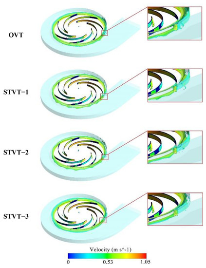 To visually display the enstrophy of the flow in each model pump, the distribution of enstrophy per unit volume (i.e., , simply called enstrophy density) in the flow is analyzed . Figure 13 shows the isosurface distribution of the enstrophy density in the four model pumps, and the value of the isosurface was 65,000. It can be observed that in the impeller domain, the enstrophy of the flow is primarily distributed on the blade pressure side and near the leading edge of the blade. In the volute domain, the enstrophy of the flow was mainly distributed near the tongue and impeller outlet. Higher enstrophy was observed near the tongue. Because the clearance between the volute wall and blade was the smallest, the energy dissipation in this area was the largest. There is little difference in the enstrophy distribution of the four model pumps in the impeller, which shows that the bionic tongue cannot significantly reduce energy dissipation in the impeller. Near the tongue, the enstrophy of bionic pumps was much lower than that of the OVT profile. The OVT profile has extremely high−energy dissipation at the downstream tongue. The energy loss of the STVT profiles was concentrated only on the tongue. The enstrophy profiles of STVT−1 and STVT−2 involve several small areas in this region, whereas the STVT−3 profile has almost no enstrophy. This is similar to the conclusions drawn from Figure 12.