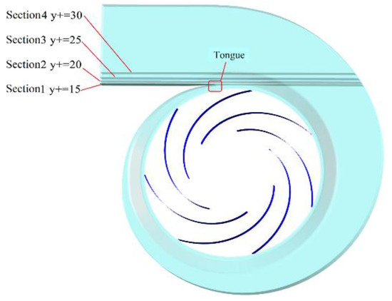 The above results show that the bionic tongue has a significant impact on the flow in the tongue area, particularly downstream of the tongue, and has little impact on the impeller domain. As shown in Figure 14, four sections with y+ of 15, 20, 25, and 30 in the downstream region of the tongue were selected to analyze the enstrophy distribution.