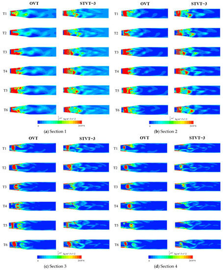 The enstrophy in the flow of the OVT and STVT−3 profiles is concentrated around the tongue, where large shedding vortices exist and a large energy loss is experienced. In Section 1 and Section 2, the high−energy loss area of the OVT profile first shows an increasing trend and then decreases with time, as shown in Figure 15a,b. At time T1, the energy loss was the smallest. After that, the high−energy loss area extended in the downstream direction of the tongue, reached a maximum at time T4, and then decreased in the reverse direction. This is because in the entire period (T1–T6), the blade sweeps through the tongue, and the distance between the blade and tongue is the shortest at time T3. The clearance between the blade and tongue was the smallest, and the interaction between the rotor and the stator has the greatest influence. This leads to the maximum energy loss at this moment. In Section 3 and Section 4, the energy dissipation of the OVT is significantly weakened in the tongue region. At time T1, only a large area of concentrated energy loss was observed. As time passes, the high−energy loss area moves backward as a whole and slowly splits into several small pieces until it disappears. This is because vortices flow in the downstream direction of the tongue near the wall (y+ < 10). Fluctuations occurred at y+ = 15−20. From time T1 to T4, the vortices moved in the vertical direction to the high y+ section. As the distance from the wall becomes larger, the turbulent fluctuation decreases and the energy loss is further reduced, which results in a much smaller energy loss area in Section 3 and Section 4 than in Section 1 and Section 2. In the horizontal direction, as the blade sweeps across the tongue area, the streamwise vortices move downstream to the tongue and then disappear slowly. This results in a downstream movement of the high−energy dissipation zone of Section 3 and Section 4.