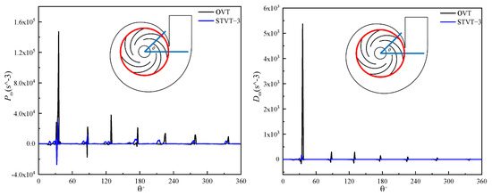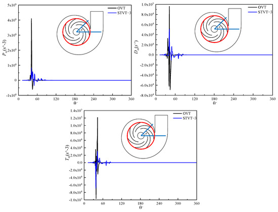 Figure 17 shows the three terms at the intersection between the midplane and volute wall (illustrated as a red curve in the pump sketch). In contrast to the seven peaks of each curve in Figure 16, there was only one peak near the tongue, and the fluctuation near the tongue was much greater. Compared with the impeller outlet area, the amplitude of each peak increased significantly. This can be explained by the vortex tube stretching and the vorticity of the wake vortex shedding from the trailing edge of the blade increasing, which increases mechanical energy dissipation. Compared with OVT, STVT−3 had the largest reduction in the peak of the production term near the tongue. The results indicate that the STVT−3 bionic tongue structure can most significantly reduce the energy loss near the tongue.