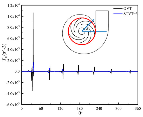 The left side of the above formula represents the growth rate of enstrophy along the particle track. The right−hand side represents the production of enstrophy, where is the tensor of the strain rate. If the deformation of the flow stretches the vortex tube, the entropy increases, which accelerates the energy dissipation and loss of mechanical energy. is an enstrophy and molecular diffusion mechanism. is the molecular viscosity dissipation of enstrophy, which always increase dissipation. All three terms are then given as time−averaged variables from the transient simulation results. As indicated above, the STVT−3 profile had the best improvement effect. Therefore, we studied the energy−loss characteristics of the OVT and STVT−3 profiles according to the enstrophy transport equation.