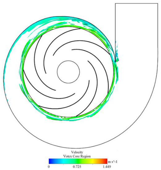Various scholars have made significant progress in the research and analysis of the internal energy loss characteristics of centrifugal pumps. The energy loss of a centrifugal pump has an impact on its performance. Further understanding of the energy loss mechanism can guide the structural design and optimization of centrifugal pumps [1]. Wu et al. [2] modified the trailing edge of blades on the suction plane of mixed−flow pumps and introduced a local Eulerian head to reveal the energy−loss pattern along the flow direction of the blades inside the impeller. Hou et al. [3] focused on the magnitude and location of the irreversible hydraulic loss of a two−stage liquefied natural gas (LNG) cryogenic submersible pump based on the entropy production theory. Singh et al. [4] investigated the effect of impeller rounding using a mixed−flow pump as a research model based on the premise of hydraulic performance optimization. Kara Omar et al. [5] combined theoretical and empirical formulations of the energy−loss equation to write a program for studying the performance of a centrifugal pump. Enstrophy can effectively analyze the motion of turbulent fluids and the loss of energy [6]. Lin et al. [7] used the enstrophy dissipation method to investigate the energy loss mechanism of pumps as turbines (PAT) under different flow conditions. They found that this method could accurately predict the location of the hydraulic loss.