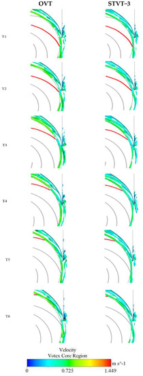 As shown in Figure 12, the enstrophy curve of the flow shows seven blade−passing periods when each impeller rotates by one revolution. Among them, the flow enstrophy of the profile of STVT−3 has the maximum decrease. Therefore, the distribution of the STVT−3 and the OVT profiles enstrophy at six evenly distributed times (T1–T6) in approximately one blade passing period was analyzed, and the rotation angle from Tn−1 to Tn is 9°, as shown in Figure 15.