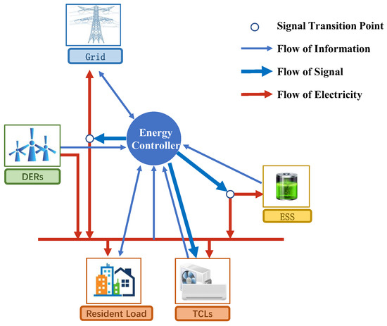 The architecture of the wind-storage cooperative model is shown in Figure 1. Three layers exist: the electricity layer, information layer, and signal layer. The electricity layer includes a distributed energy resources (DER) based on wind power, an energy storage system (ESS) for the storage and release of wind power energy, a group of thermostatically controlled loads (TCLs), and a group of price responsive loads. The information layer is composed of a two-way communication system between the external power grid, each power module, and the energy controller (EC). Information such as electricity price, as well as the battery charge and discharge status are transmitted in the information layer. The signal layer transmits the control signals sent by the energy controller to each controllable module. The whole system model has three direct control points, namely, the switch control of TCLs, the charging and discharging control of ESS, and the trading control of energy on the external power grid.