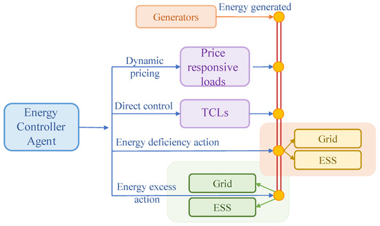 In this study, EC can extract the information provided by different modules and the observable environment to determine the best supply and demand balance strategy. EC mainly manages the power grid through four control mechanisms, as shown in Figure 2, including TCL direct control, price level control, energy deficiency action, and energy excess action.