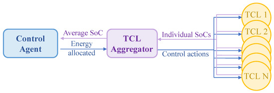 At each time step , EC will allocate a certain amount of electric energy for TCLs. Then, they will be distributed to each TCL through a TCL aggregator. The TCL aggregator judges the priority of energy distribution according to the power delivered by EC and the SoC of each TCL, and then determines the on/off action of each TCL: TCL with a lower SoC has a higher priority in energy allocation than TCL with a higher SoC. The TCL aggregator also operates as an information aggregator transmitting the real-time average SoC information of the TCL cluster to EC [31]. The specific transmission process is shown in Figure 3.