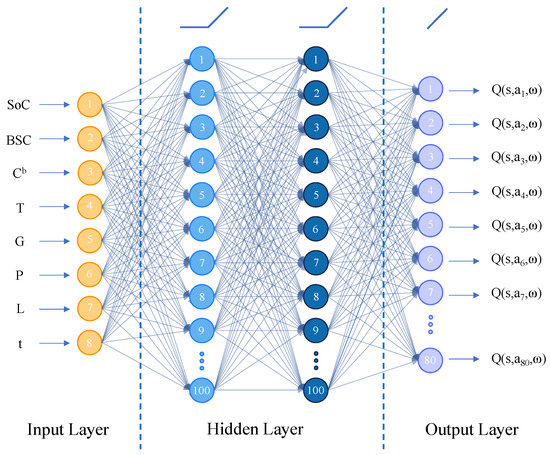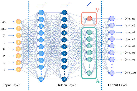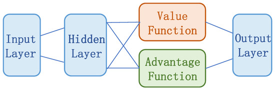 (2) In this paper, the structure of the deep neural network is adjusted. Referring to dueling DQN based on competitive architecture, the main output is divided into two parts: one part is the state-value function , which represents the current state; the other part is the advantage function , which judges the additional value level of each action for the current state. The neural network structure of DQN is shown in Figure 4, and the neural network structure of D3QN is shown in Figure 5.